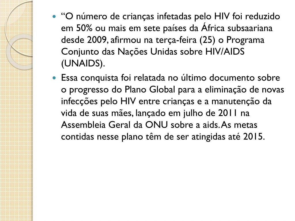 “O número de crianças infetadas pelo HIV foi reduzido em 50% ou mais em sete países da África subsaariana desde 2009, afirmou na terça-feira (25) o Programa Conjunto das Nações Unidas sobre HIV/AIDS (UNAIDS). • Essa conquista foi relatada no último documento sobre o progresso do Plano Global para a eliminação de novas infecções pelo HIV entre crianças e a manutenção da vida de suas mães, lançado em julho de 2011 na Assembleia Geral da ONU sobre a aids. As metas contidas nesse plano têm de ser atingidas até 2015.