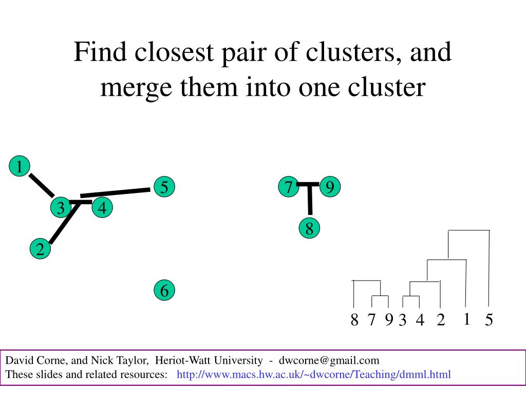 Find closest pair of clusters, and merge them into one cluster 1 5 7 9 3 4 8 2 6 7 9 8 2 3 4 David Corne, and Nick Taylor, Heriot-Watt University - dwcorne@gmail.com These slides and related resources: http://www.macs.hw.ac.uk/~dwcorne/Teaching/dmml.html