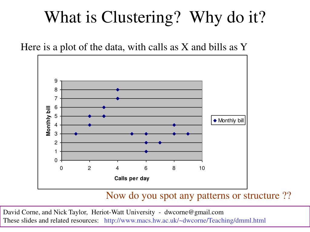 What is Clustering? Why do it? Here is a plot of the data, with calls as X and bills as Y Now do you spot any patterns or structure ?? David Corne, and Nick Taylor, Heriot-Watt University - dwcorne@gmail.com These slides and related resources: http://www.macs.hw.ac.uk/~dwcorne/Teaching/dmml.html