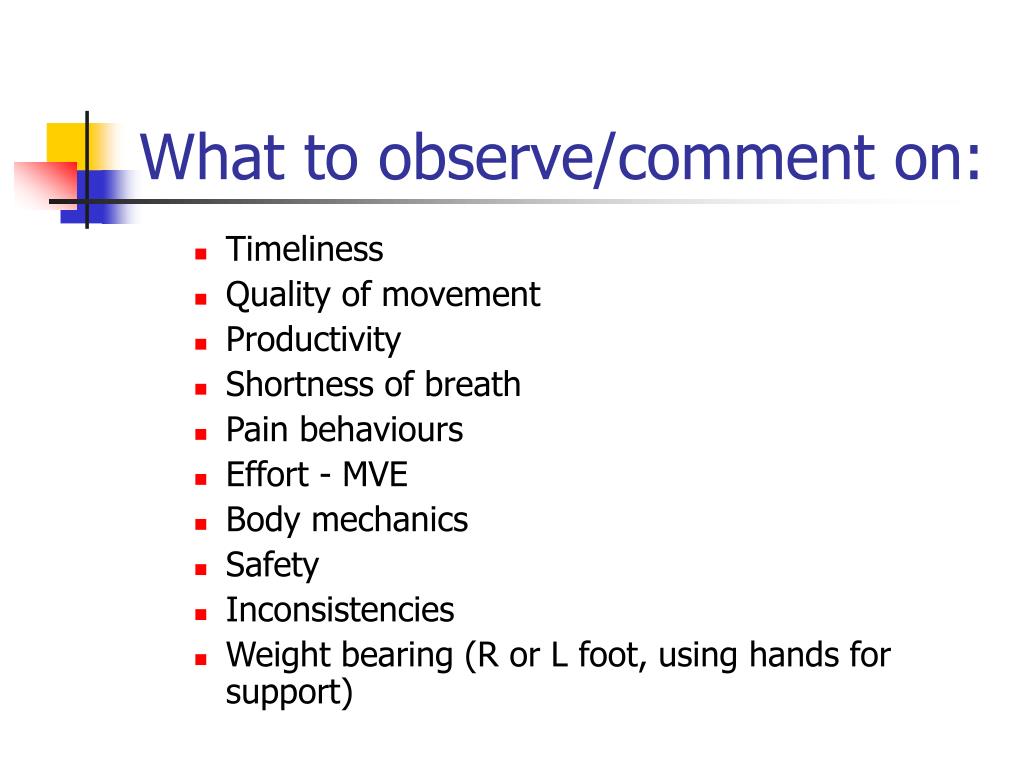 What to observe/comment on: • Timeliness • Quality of movement • Productivity • Shortness of breath • Pain behaviours • Effort - MVE • Body mechanics • Safety • Inconsistencies • Weight bearing (R or L foot, using hands for support)