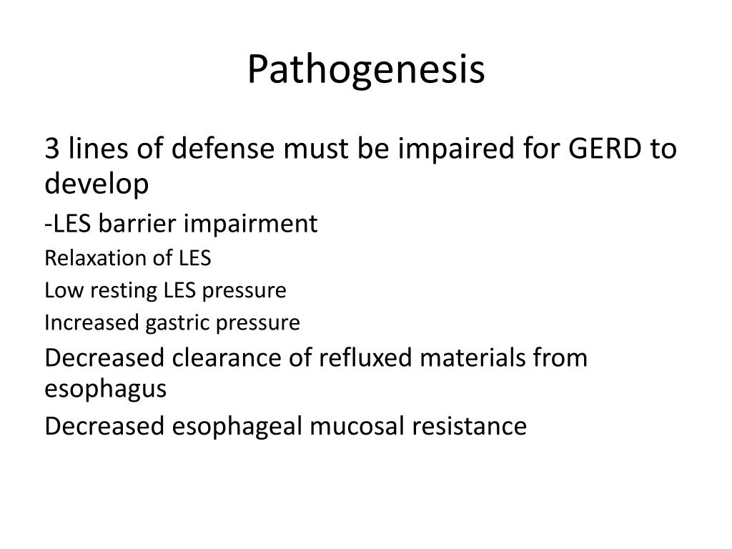 Pathogenesis 3 lines of defense must be impaired for GERD to develop -LES barrier impairment Relaxation of LES Low resting LES pressure Increased gastric pressure Decreased clearance of refluxed materials from esophagus Decreased esophageal mucosal resistance