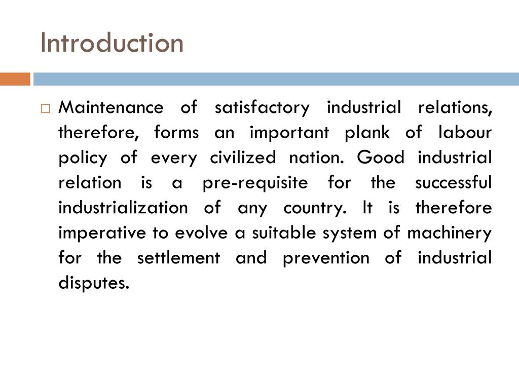 Introduction • Maintenance of satisfactory industrial relations, therefore, forms an important plank of labour policy of every civilized nation. Good industrial relation is a pre-requisite for the successful industrialization of any country. It is therefore imperative to evolve a suitable system of machinery for the settlement and prevention of industrial disputes.