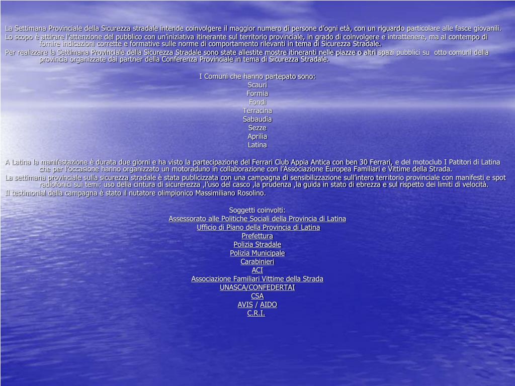 La Settimana Provinciale della Sicurezza stradale intende coinvolgere il maggior numero di persone d’ogni età, con un riguardo particolare alle fasce giovanili. Lo scopo è attirare l’attenzione del pubblico con un’iniziativa itinerante sul territorio provinciale, in grado di coinvolgere e intrattenere, ma al contempo di fornire indicazioni corrette e formative sulle norme di comportamento rilevanti in tema di Sicurezza Stradale. Per realizzare la Settimana Provinciale della Sicurezza Stradale sono state allestite mostre itineranti nelle piazze o altri spazi pubblici su otto comuni della provincia organizzate dai partner della Conferenza Provinciale in tema di Sicurezza Stradale. I Comuni che hanno partepato sono: Scauri Formia Fondi Terracina Sabaudia Sezze Aprilia Latina A Latina la manifestazione è durata due giorni e ha visto la partecipazione del Ferrari Club Appia Antica con ben 30 Ferrari, e del motoclub I Patitori di Latina che per l’occasione hanno organizzato un motoraduno in collaborazione con l’Associazione Europea Familiari e Vittime della Strada. La settimana provinciale sulla sicurezza stradale è stata publicizzata con una campagna di sensibilizzazione sull’intero territorio provinciale con manifesti e spot radiofonici sui temi: uso della cintura di sicurerezza ,l’uso del casco ,la prudenza ,la guida in stato di ebrezza e sul rispetto dei limiti di velocità. Il testimonial della campagna è stato il nutatore olimpionico Massimiliano Rosolino. Soggetti coinvolti: Assessorato alle Politiche Sociali della Provincia di Latina Ufficio di Piano della Provincia di Latina Prefettura Polizia Stradale Polizia Municipale Carabinieri ACI Associazione Familiari Vittime della Strada UNASCA/CONFEDERTAI CSA AVIS / AIDO C.R.I.