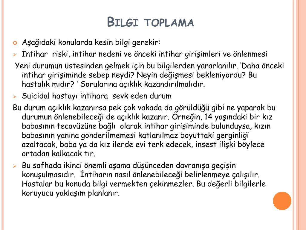 Bilgi toplama • Aşağıdaki konularda kesin bilgi gerekir: • İntihar riski, intihar nedeni ve önceki intihar girişimleri ve önlenmesi Yeni durumun üstesinden gelmek için bu bilgilerden yararlanılır. ‘Daha önceki intihar girişiminde sebep neydi? Neyin değişmesi bekleniyordu? Bu hastalık mıdır? ‘ Sorularına açıklık kazandırılmalıdır. • Suicidal hastayı intihara sevk eden durum Bu durum açıklık kazanırsa pek çok vakada da görüldüğü gibi ne yaparak bu durumun önlenebileceği de açıklık kazanır. Örneğin, 14 yaşındaki bir kız babasının tecavüzüne bağlı olarak intihar girişiminde bulunduysa, kızın babasının yanına gönderilmemesi katlanılmaz boyuttaki gerginliği azaltacak, baba ya da kız ilerde evi terk edecek, insest ilişki böylece ortadan kalkacak tır. • Bu safhada ikinci önemli aşama düşünceden davranışa geçişin konuşulmasıdır. İntiharın nasıl önlenebileceği belirlenmeye çalışılır. Hastalar bu konuda bilgi vermekten çekinmezler. Bu değerli bilgilerle koruyucu yaklaşım planlanır.