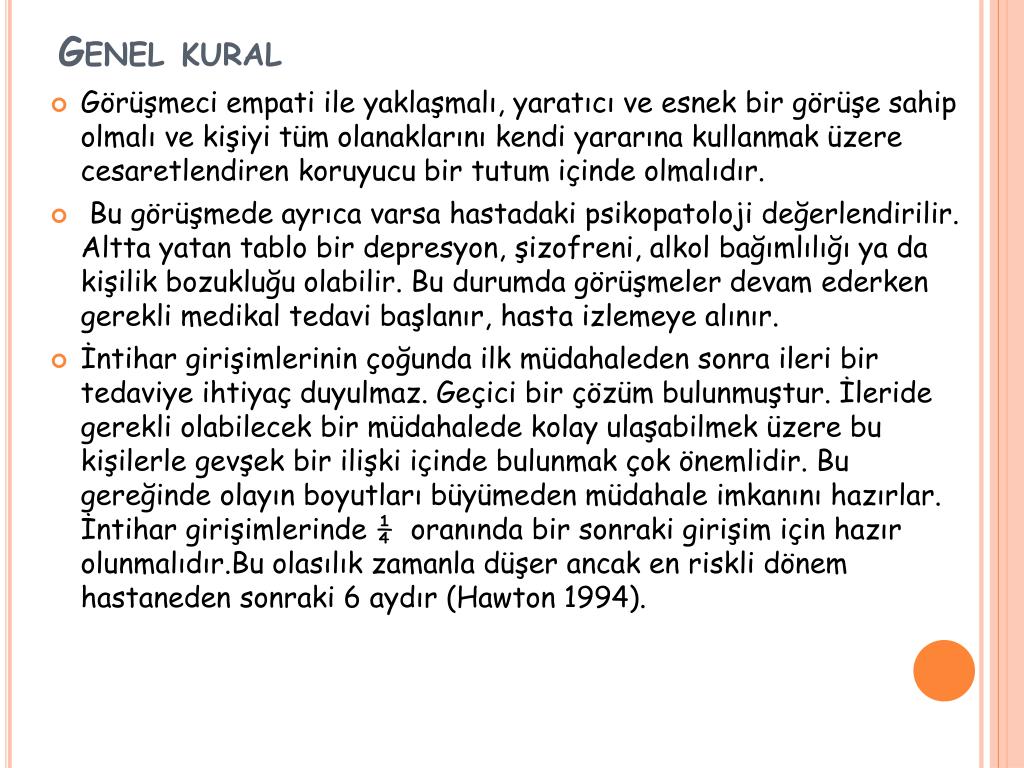 Genel kural • Görüşmeci empati ile yaklaşmalı, yaratıcı ve esnek bir görüşe sahip olmalı ve kişiyi tüm olanaklarını kendi yararına kullanmak üzere cesaretlendiren koruyucu bir tutum içinde olmalıdır. • Bu görüşmede ayrıca varsa hastadaki psikopatoloji değerlendirilir. Altta yatan tablo bir depresyon, şizofreni, alkol bağımlılığı ya da kişilik bozukluğu olabilir. Bu durumda görüşmeler devam ederken gerekli medikal tedavi başlanır, hasta izlemeye alınır. • İntihar girişimlerinin çoğunda ilk müdahaleden sonra ileri bir tedaviye ihtiyaç duyulmaz. Geçici bir çözüm bulunmuştur. İleride gerekli olabilecek bir müdahalede kolay ulaşabilmek üzere bu kişilerle gevşek bir ilişki içinde bulunmak çok önemlidir. Bu gereğinde olayın boyutları büyümeden müdahale imkanını hazırlar. İntihar girişimlerinde ¼ oranında bir sonraki girişim için hazır olunmalıdır.Bu olasılık zamanla düşer ancak en riskli dönem hastaneden sonraki 6 aydır (Hawton 1994).