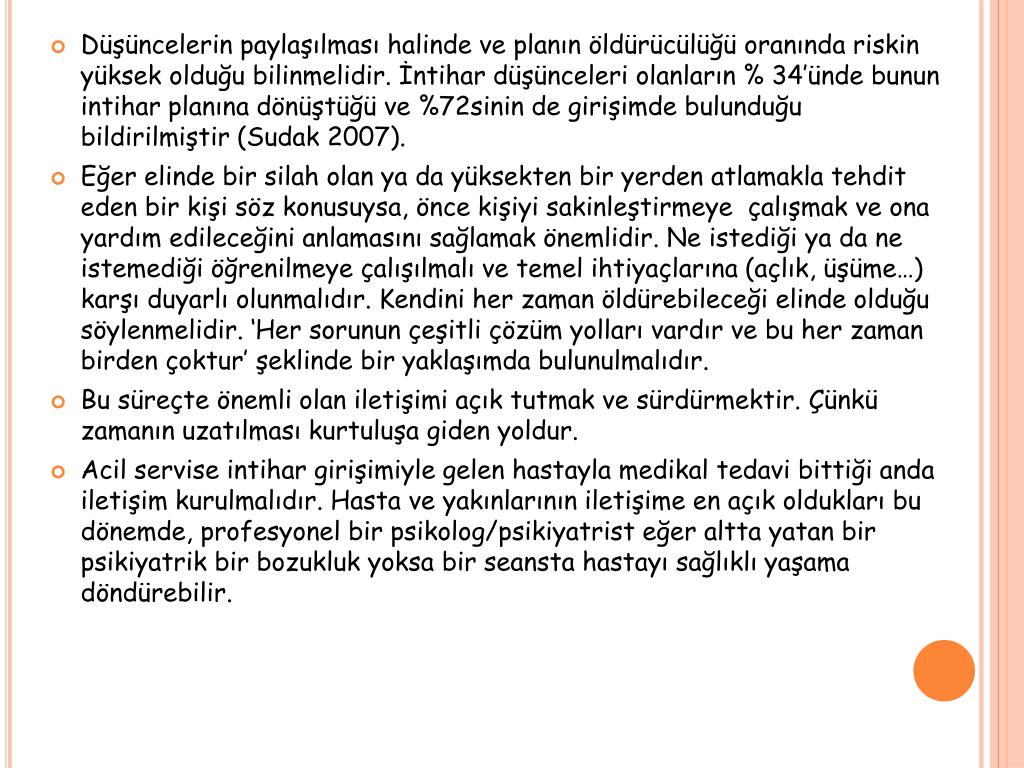 Düşüncelerin paylaşılması halinde ve planın öldürücülüğü oranında riskin yüksek olduğu bilinmelidir. İntihar düşünceleri olanların % 34’ünde bunun intihar planına dönüştüğü ve %72sinin de girişimde bulunduğu bildirilmiştir (Sudak 2007). • Eğer elinde bir silah olan ya da yüksekten bir yerden atlamakla tehdit eden bir kişi söz konusuysa, önce kişiyi sakinleştirmeye çalışmak ve ona yardım edileceğini anlamasını sağlamak önemlidir. Ne istediği ya da ne istemediği öğrenilmeye çalışılmalı ve temel ihtiyaçlarına (açlık, üşüme…) karşı duyarlı olunmalıdır. Kendini her zaman öldürebileceği elinde olduğu söylenmelidir. ‘Her sorunun çeşitli çözüm yolları vardır ve bu her zaman birden çoktur’ şeklinde bir yaklaşımda bulunulmalıdır. • Bu süreçte önemli olan iletişimi açık tutmak ve sürdürmektir. Çünkü zamanın uzatılması kurtuluşa giden yoldur. • Acil servise intihar girişimiyle gelen hastayla medikal tedavi bittiği anda iletişim kurulmalıdır. Hasta ve yakınlarının iletişime en açık oldukları bu dönemde, profesyonel bir psikolog/psikiyatrist eğer altta yatan bir psikiyatrik bir bozukluk yoksa bir seansta hastayı sağlıklı yaşama döndürebilir.
