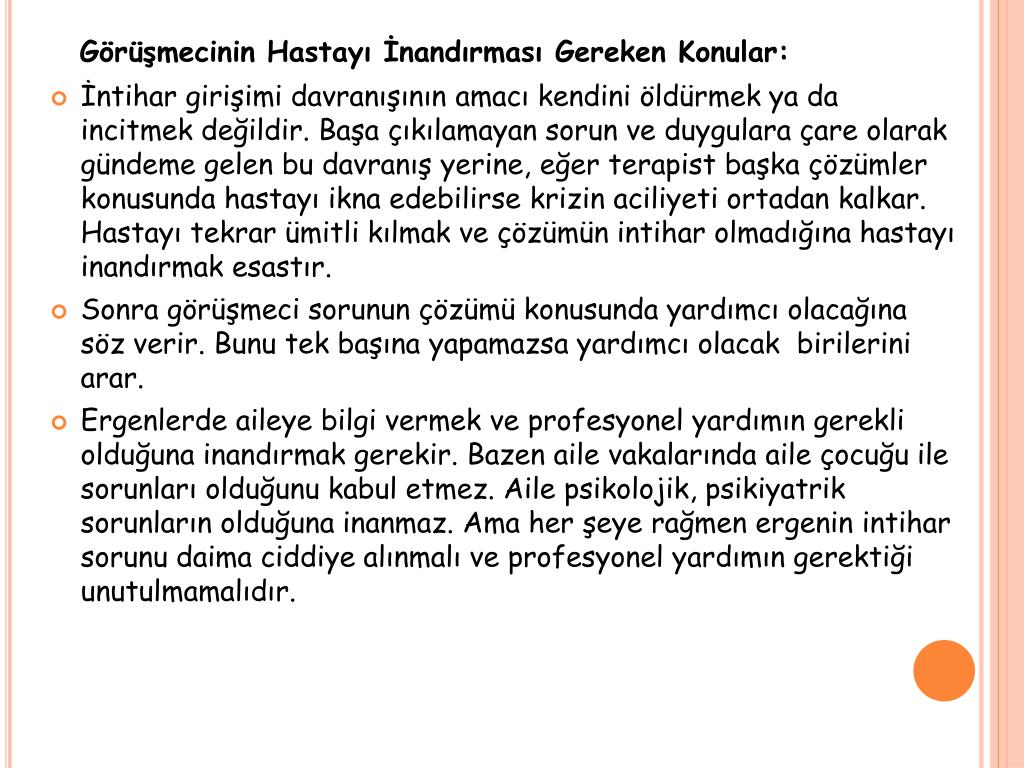 Görüşmecinin Hastayı İnandırması Gereken Konular: • İntihar girişimi davranışının amacı kendini öldürmek ya da incitmek değildir. Başa çıkılamayan sorun ve duygulara çare olarak gündeme gelen bu davranış yerine, eğer terapist başka çözümler konusunda hastayı ikna edebilirse krizin aciliyeti ortadan kalkar. Hastayı tekrar ümitli kılmak ve çözümün intihar olmadığına hastayı inandırmak esastır. • Sonra görüşmeci sorunun çözümü konusunda yardımcı olacağına söz verir. Bunu tek başına yapamazsa yardımcı olacak birilerini arar. • Ergenlerde aileye bilgi vermek ve profesyonel yardımın gerekli olduğuna inandırmak gerekir. Bazen aile vakalarında aile çocuğu ile sorunları olduğunu kabul etmez. Aile psikolojik, psikiyatrik sorunların olduğuna inanmaz. Ama her şeye rağmen ergenin intihar sorunu daima ciddiye alınmalı ve profesyonel yardımın gerektiği unutulmamalıdır.