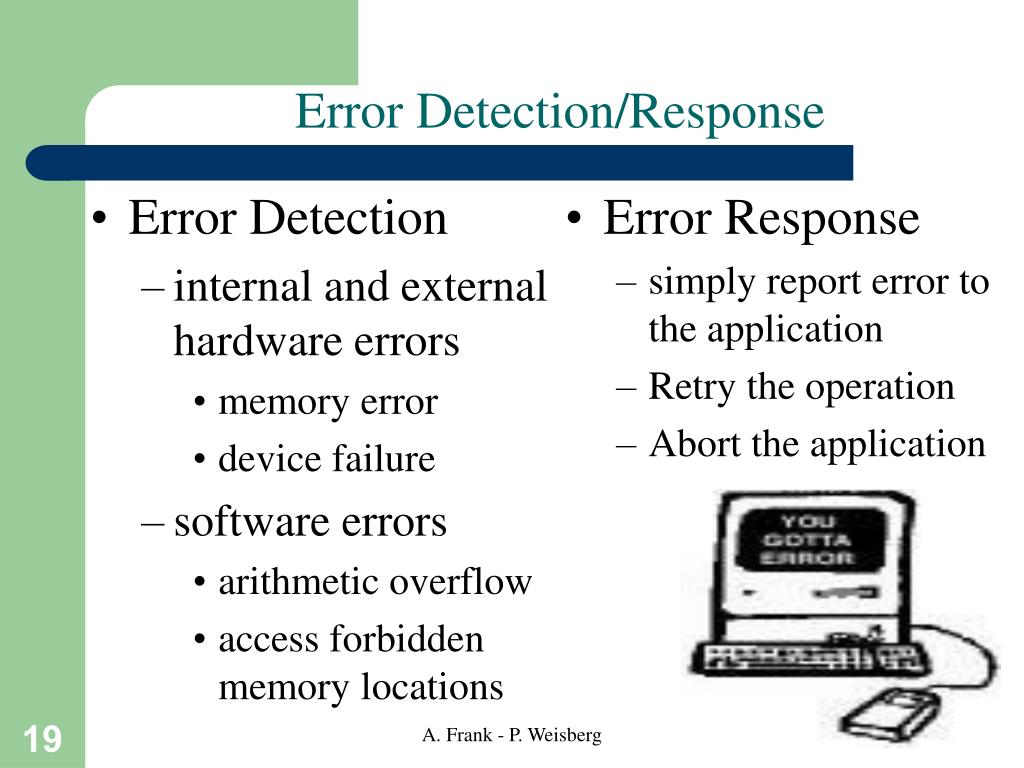 Error Detection internal and external hardware errors memory error device failure software errors arithmetic overflow access forbidden memory locations Error Response simply report error to the application Retry the operation Abort the application Error Detection/Response A. Frank - P. Weisberg