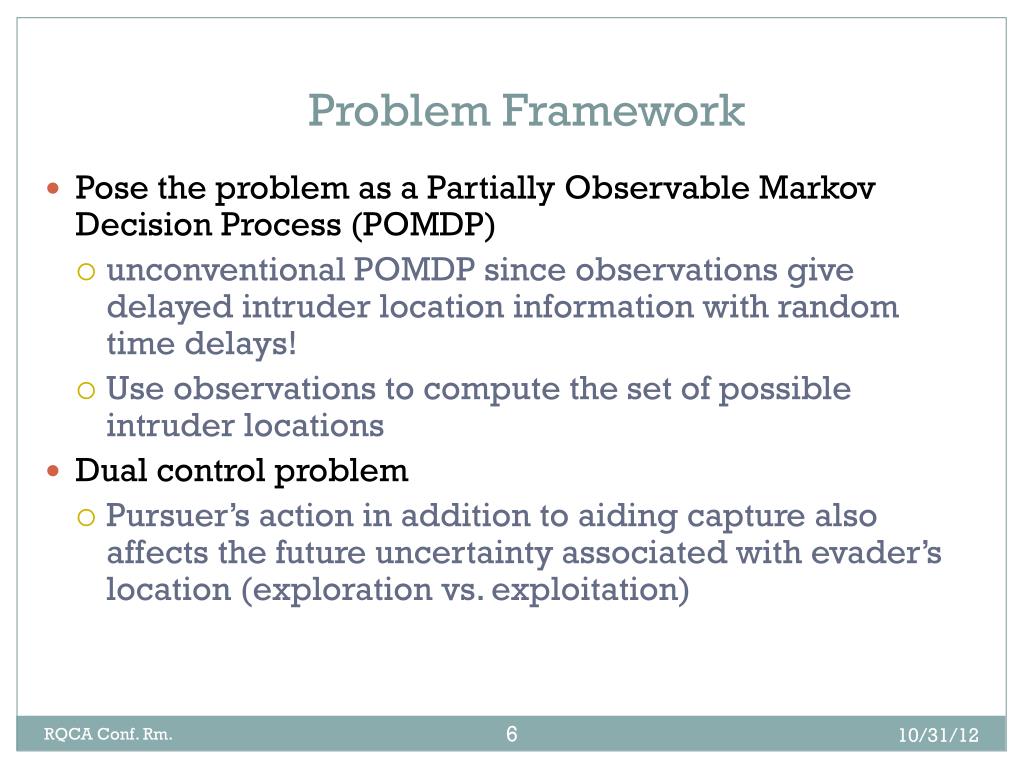 Problem Framework • Pose the problem as a Partially Observable Markov Decision Process (POMDP) • unconventional POMDP since observations give delayed intruder location information with random time delays! • Use observations to compute the set of possible intruder locations • Dual control problem • Pursuer’s action in addition to aiding capture also affects the future uncertainty associated with evader’s location (exploration vs. exploitation) RQCA Conf. Rm.