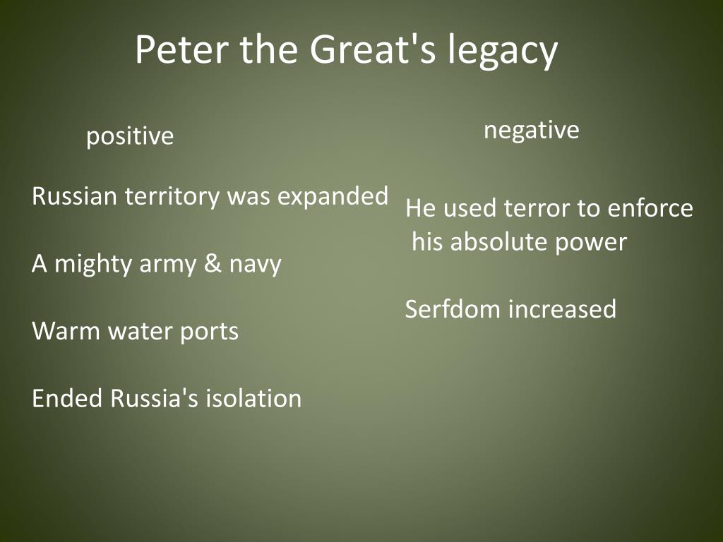 Peter the Great's legacy negative positive Russian territory was expanded A mighty army & navy Warm water ports Ended Russia's isolation He used terror to enforce his absolute power Serfdom increased
