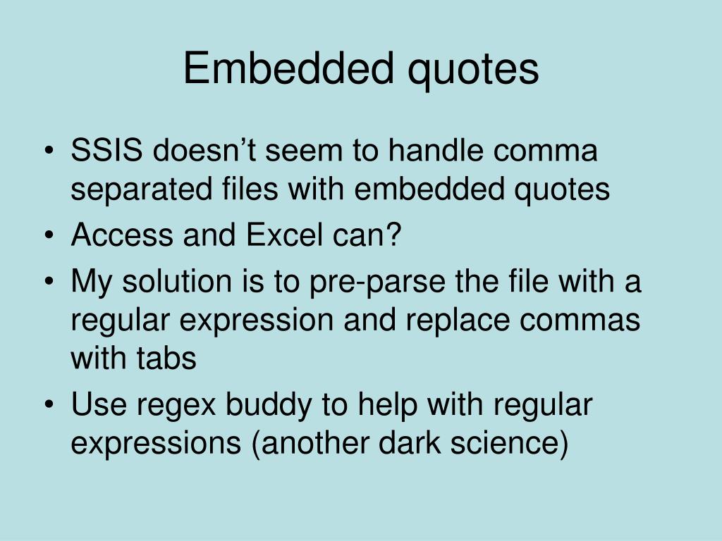 Embedded quotes • SSIS doesn’t seem to handle comma separated files with embedded quotes • Access and Excel can? • My solution is to pre-parse the file with a regular expression and replace commas with tabs • Use regex buddy to help with regular expressions (another dark science)