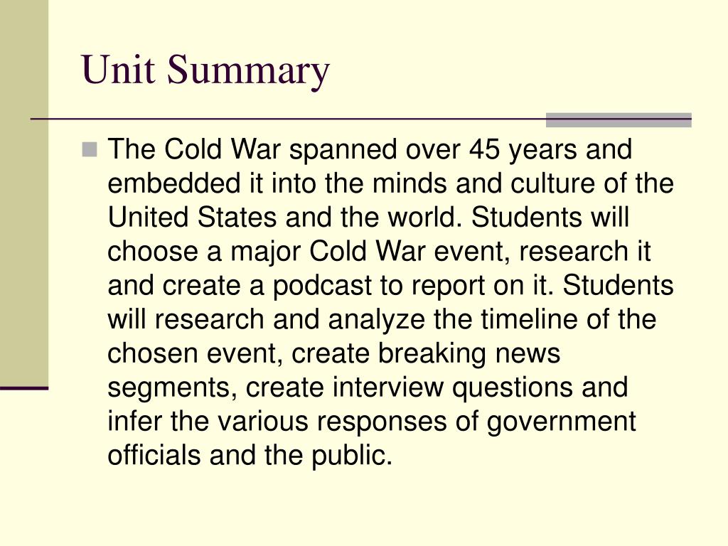 Unit Summary • The Cold War spanned over 45 years and embedded it into the minds and culture of the United States and the world. Students will choose a major Cold War event, research it and create a podcast to report on it. Students will research and analyze the timeline of the chosen event, create breaking news segments, create interview questions and infer the various responses of government officials and the public.