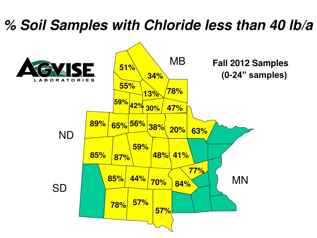% Soil Samples with Chloride less than 40 lb/a MB Fall 2012 Samples 51% (0-24” samples) 34% 55% 78% 13% 59% 42% 47% 30% 89% 56% 65% 38% 20% 63% ND 59% 85% 41% 48% 87% 77% 85% 44% MN 70% 84% SD 57% 78% 57%