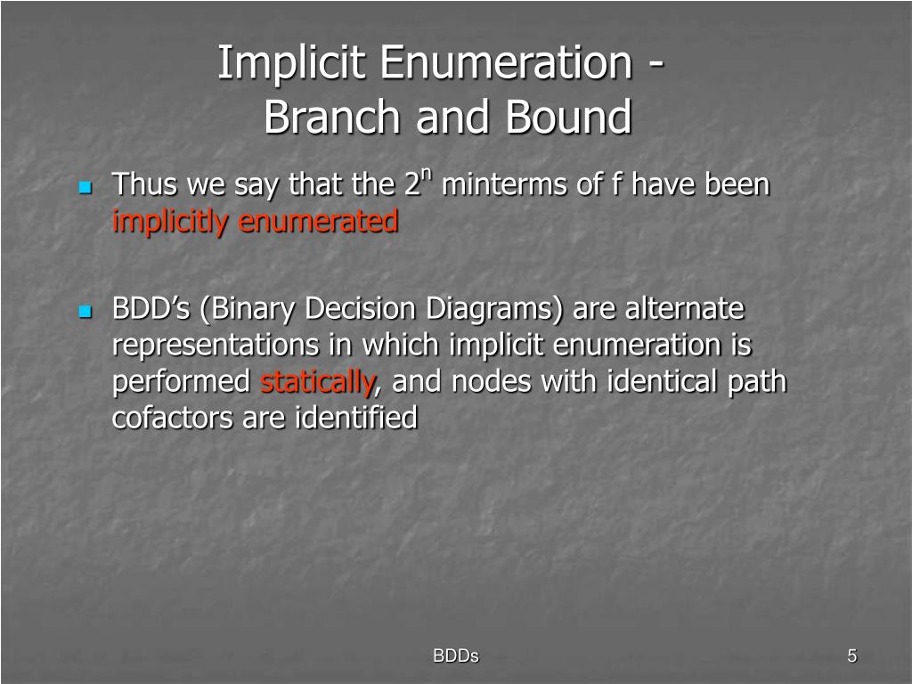 Implicit Enumeration - Branch and Bound • Thus we say that the 2n minterms of f have been implicitly enumerated • BDD’s (Binary Decision Diagrams) are alternate representations in which implicit enumeration is performed statically, and nodes with identical path cofactors are identified BDDs