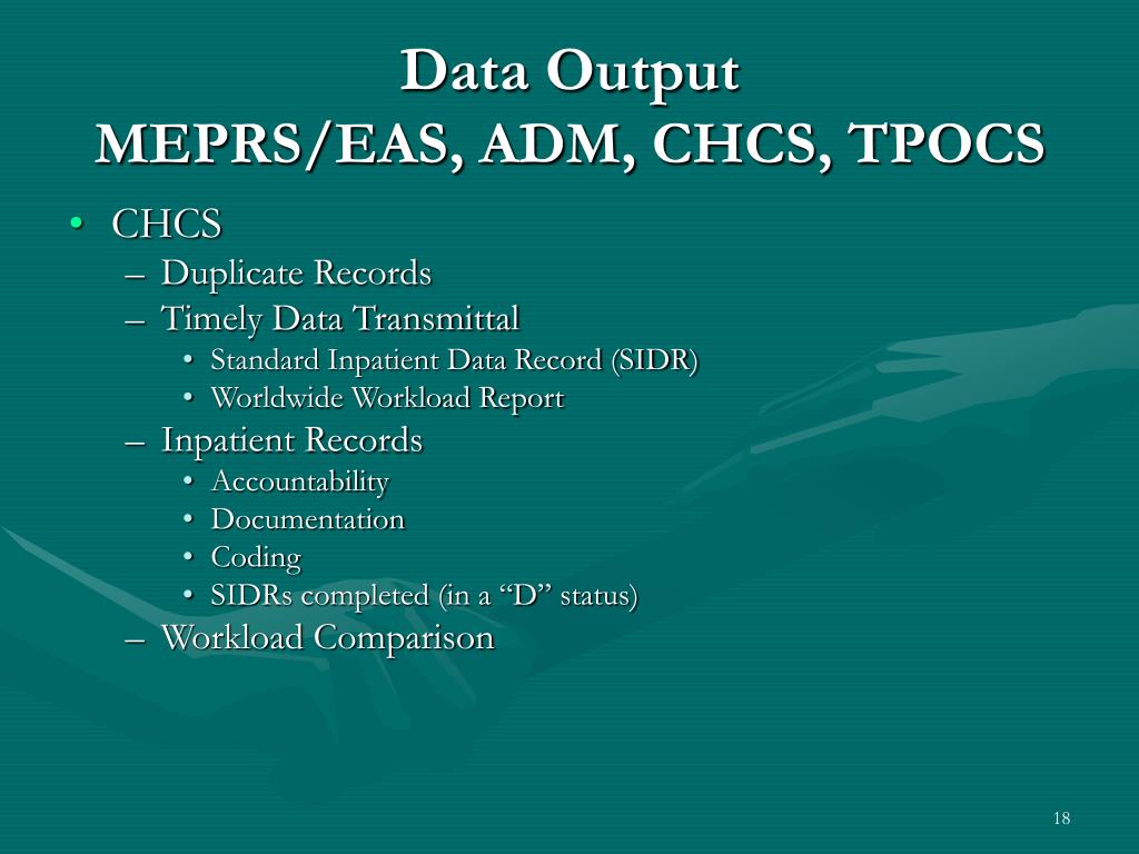 Data OutputMEPRS/EAS, ADM, CHCS, TPOCS • CHCS • Duplicate Records • Timely Data Transmittal • Standard Inpatient Data Record (SIDR) • Worldwide Workload Report • Inpatient Records • Accountability • Documentation • Coding • SIDRs completed (in a “D” status) • Workload Comparison