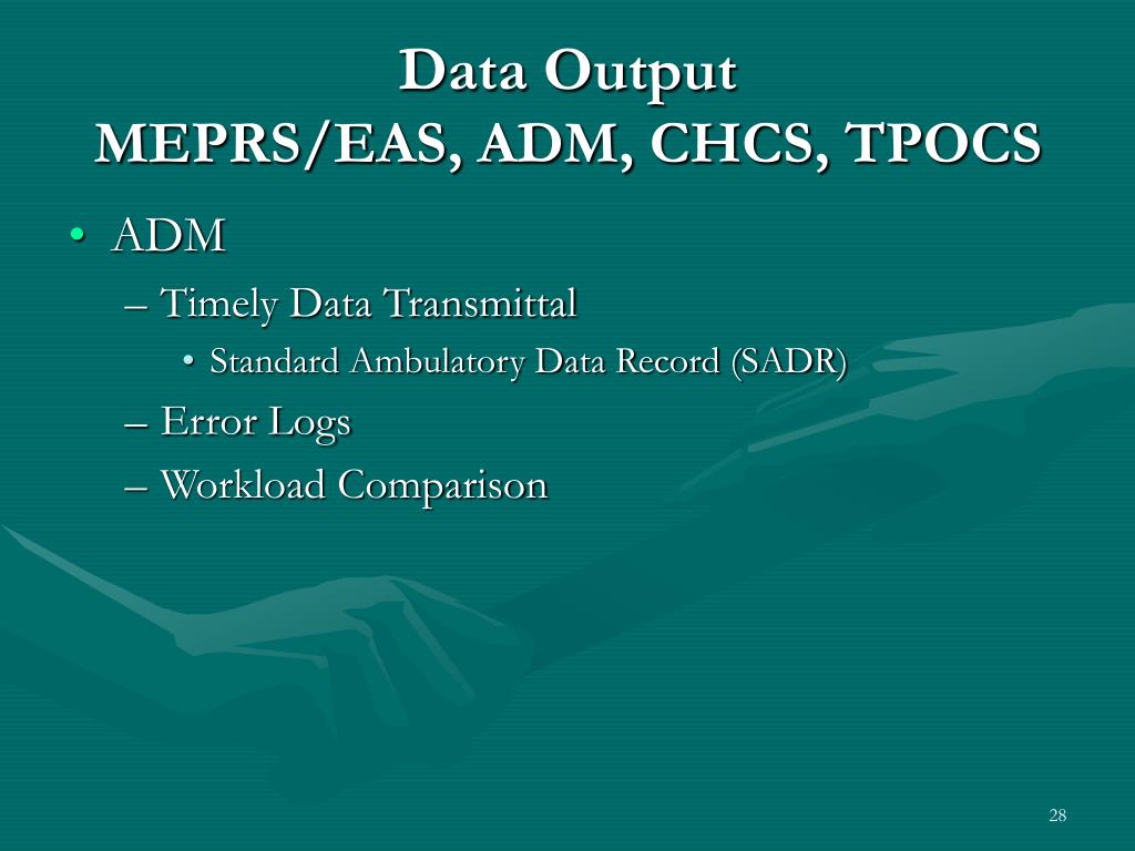 Data OutputMEPRS/EAS, ADM, CHCS, TPOCS • ADM • Timely Data Transmittal • Standard Ambulatory Data Record (SADR) • Error Logs • Workload Comparison