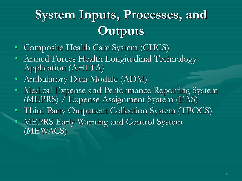 System Inputs, Processes, and Outputs • Composite Health Care System (CHCS) • Armed Forces Health Longitudinal Technology Application (AHLTA) • Ambulatory Data Module (ADM) • Medical Expense and Performance Reporting System (MEPRS) / Expense Assignment System (EAS) • Third Party Outpatient Collection System (TPOCS) • MEPRS Early Warning and Control System (MEWACS)