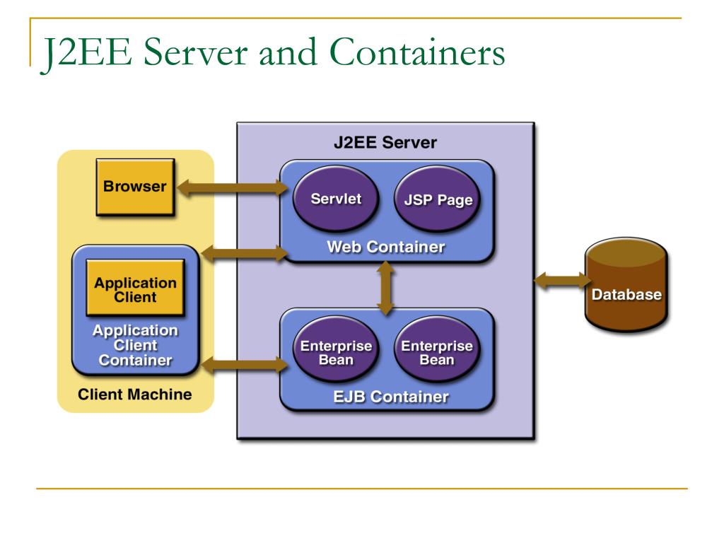 J2EE Server and Containers • J2EE server • The runtime portion of a J2EE product. A J2EE server provides EJB and Web containers. • Enterprise JavaBeans (EJB) container • Manages the execution of enterprise beans for J2EE applications. Enterprise beans and their container run on the J2EE server. • Web container • Manages the execution of JSP page and servlet components for J2EE applications. Web components and their container run on the J2EE server. • Application client container • Manages the execution of application client components. Application clients and their container run on the client. • Applet container • Manages the execution of applets. Consists of a Web browser and Java Plug-in running on the client together.