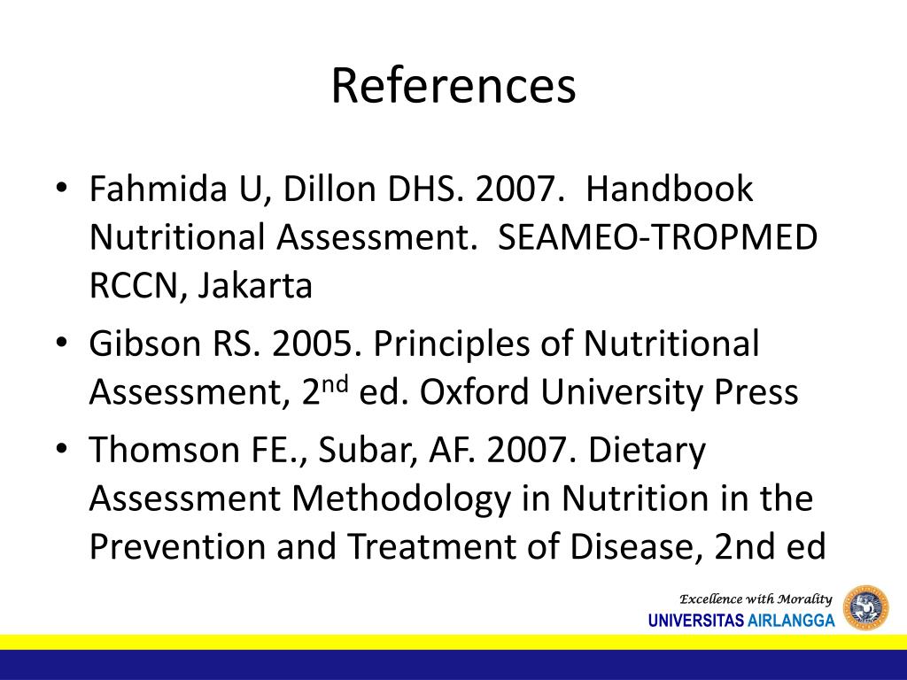 References • Fahmida U, Dillon DHS. 2007. Handbook Nutritional Assessment. SEAMEO-TROPMED RCCN, Jakarta • Gibson RS. 2005. Principles of Nutritional Assessment, 2nd ed. Oxford University Press • Thomson FE., Subar, AF. 2007. Dietary Assessment Methodology in Nutrition in the Prevention and Treatment of Disease, 2nd ed Excellence with Morality UNIVERSITASAIRLANGGA