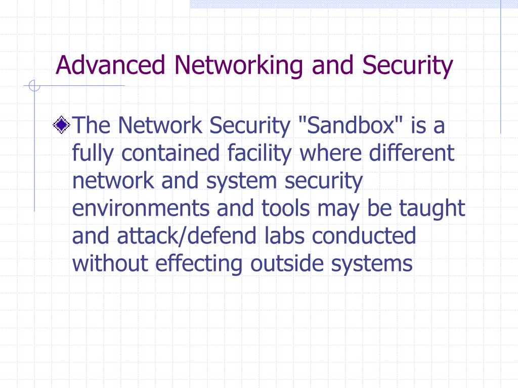 Advanced Networking and Security • The Network Security "Sandbox" is a fully contained facility where different network and system security environments and tools may be taught and attack/defend labs conducted without effecting outside systems