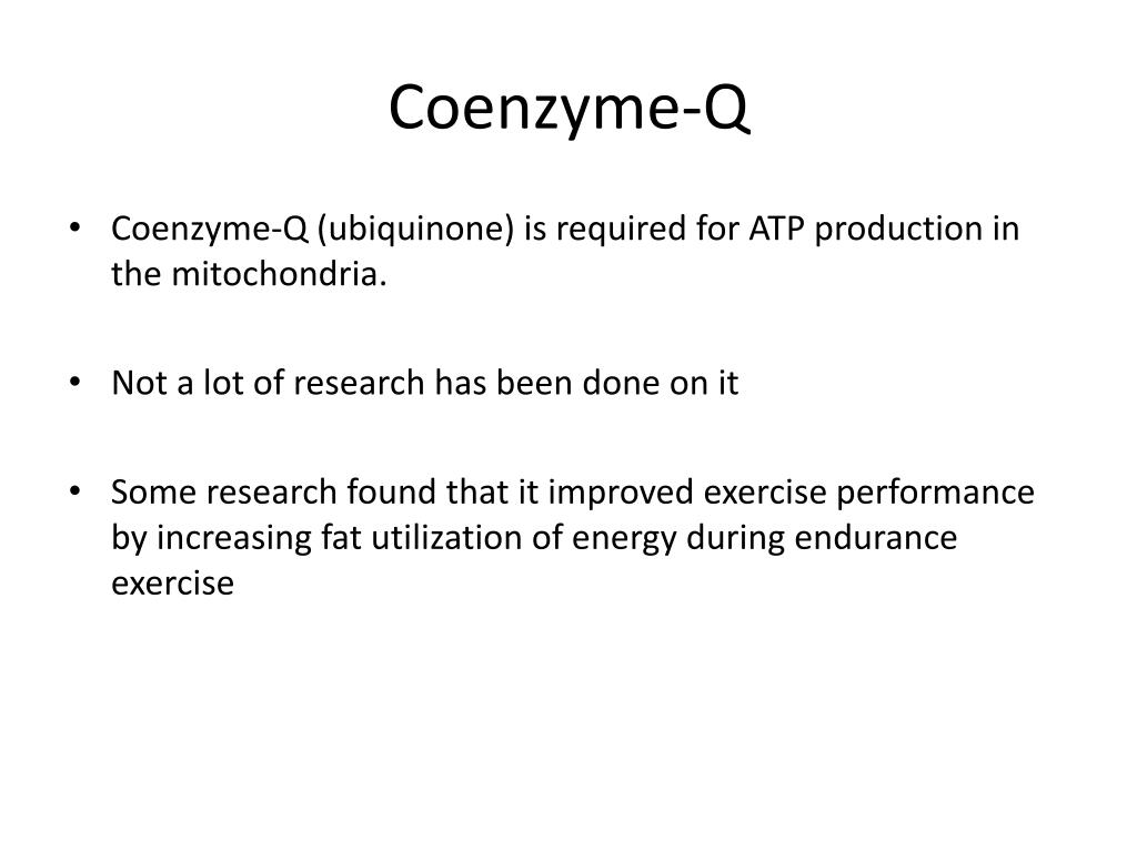 Coenzyme-Q • Coenzyme-Q (ubiquinone) is required for ATP production in the mitochondria. • Not a lot of research has been done on it • Some research found that it improved exercise performance by increasing fat utilization of energy during endurance exercise