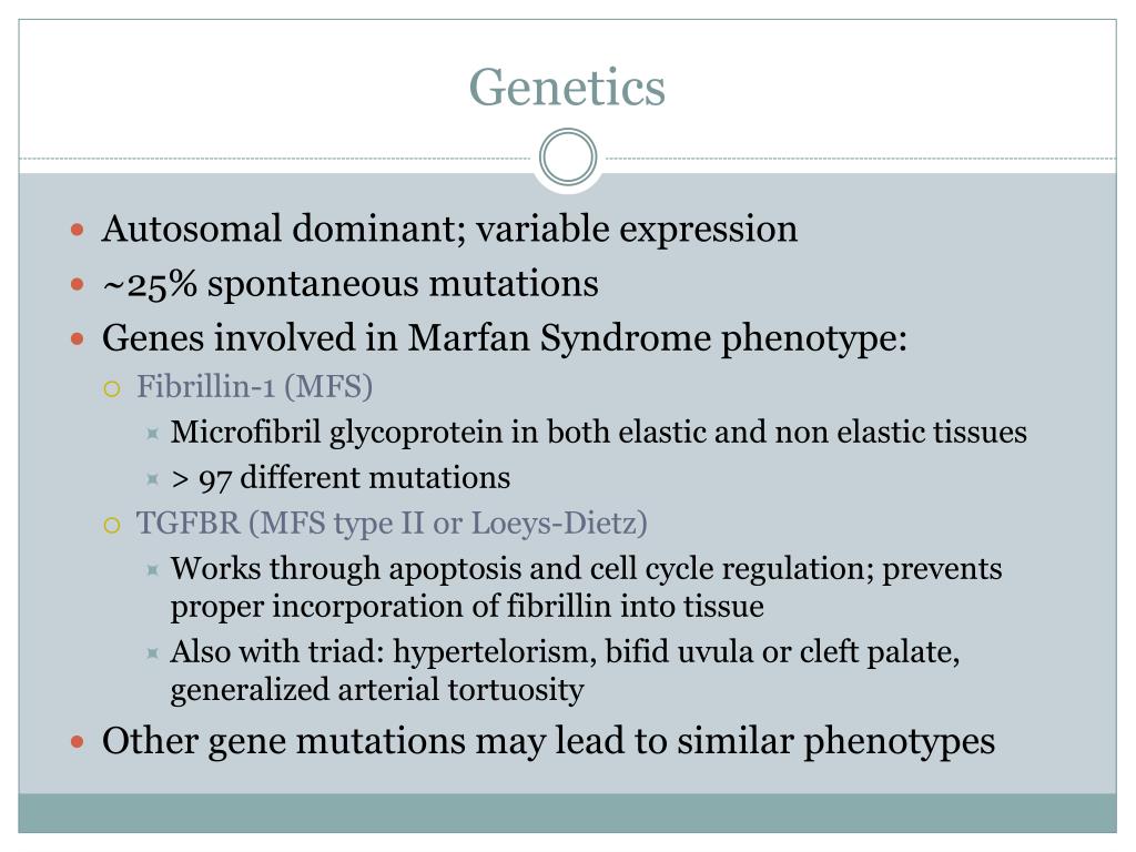 Genetics • Autosomal dominant; variable expression • ~25% spontaneous mutations • Genes involved in Marfan Syndrome phenotype: • Fibrillin-1 (MFS) • Microfibril glycoprotein in both elastic and non elastic tissues • > 97 different mutations • TGFBR (MFS type II or Loeys-Dietz) • Works through apoptosis and cell cycle regulation; prevents proper incorporation of fibrillin into tissue • Also with triad: hypertelorism, bifid uvula or cleft palate, generalized arterial tortuosity • Other gene mutations may lead to similar phenotypes