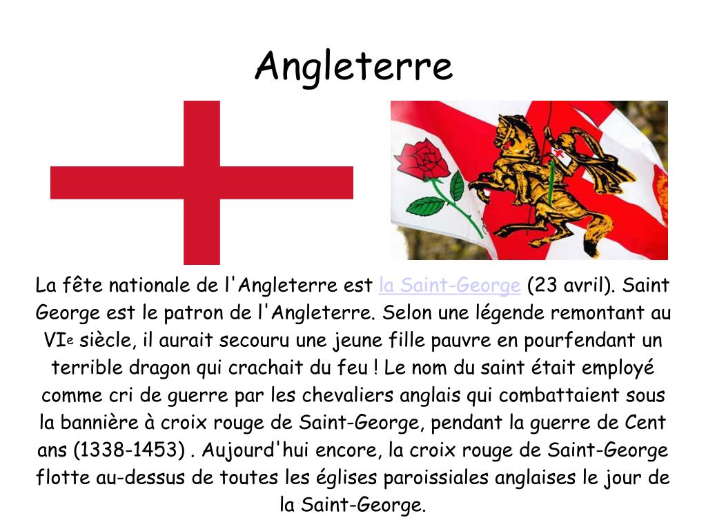 La fête nationale de l'Angleterre est la Saint-George(23 avril). Saint George est le patron de l'Angleterre. Selon une légende remontant au VIe siècle, il aurait secouru une jeune fille pauvre en pourfendant un terrible dragon qui crachait du feu ! Le nom du saint était employé comme cri de guerre par les chevaliers anglais qui combattaient sous la bannière à croix rouge de Saint-George, pendant la guerre de Cent ans (1338-1453) . Aujourd'hui encore, la croix rouge de Saint-George flotte au-dessus de toutes les églises paroissiales anglaises le jour de la Saint-George. Angleterre