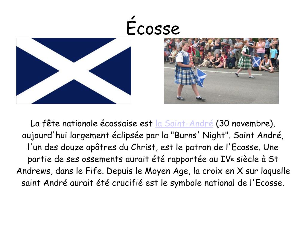 La fête nationale écossaise est la Saint-André(30 novembre), aujourd'hui largement éclipsée par la "Burns' Night". Saint André, l'un des douze apôtres du Christ, est le patron de l'Ecosse. Une partie de ses ossements aurait été rapportée au IVe siècle à St Andrews, dans le Fife. Depuis le Moyen Age, la croix en X sur laquelle saint André aurait été crucifié est le symbole national de l'Ecosse. Écosse
