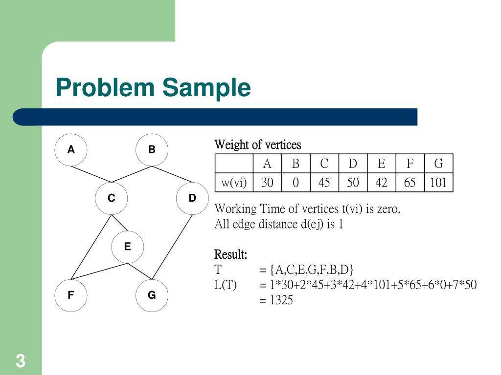 A Variation of Minimum Latency Problem on Path, Tree and DAG. Author: Yung-Hui Huang, Yaw-Ling Lin, Chuan-Yi Tang. Problem Definition. Given a graph G(V,E) with a distance matrix d i,j and the weight function of each vertices v i