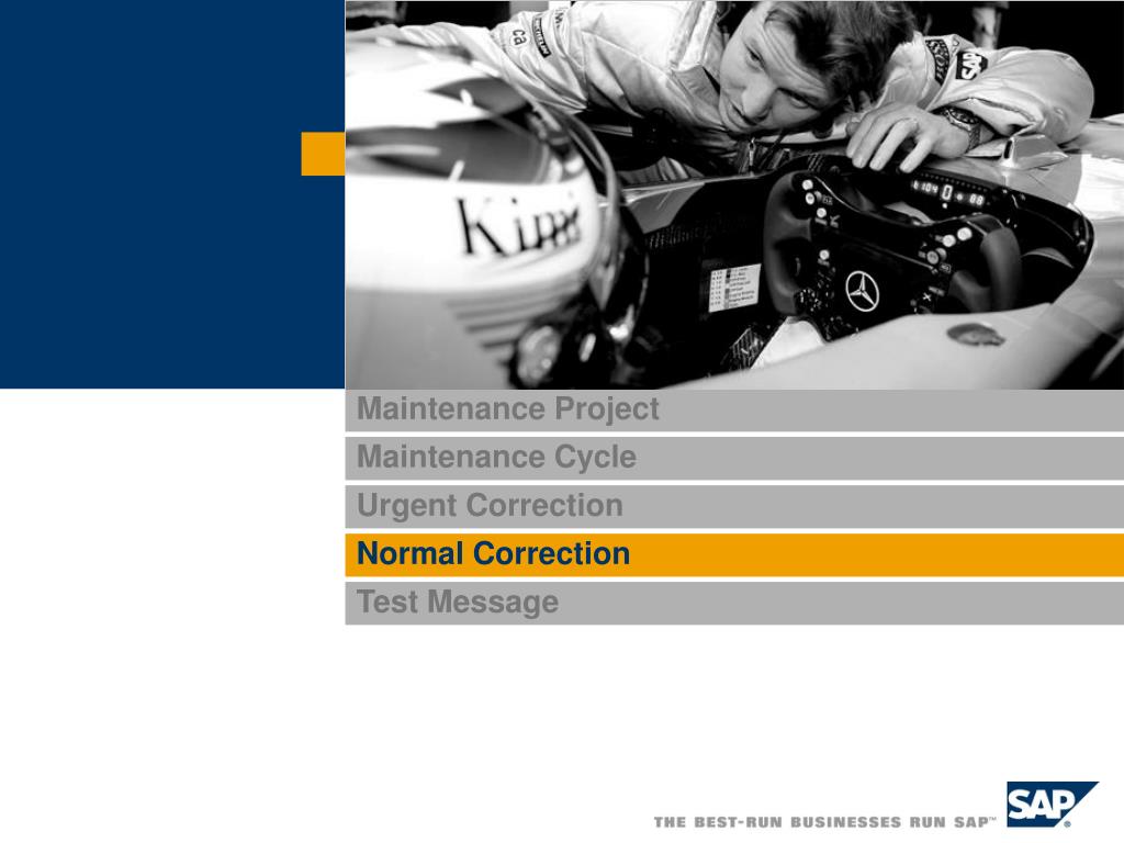 Test Message and Maintenance Cycles • Test messages can be created in status Test only. • Test messages do not require an approval. • New normal corrections can be created but not exported any more. • Urgent corrections can still be created and also propagated up to going live. • Test messages allow inserting any system of the system landscape as a reference, supposedly a test system. • Test messages must be released before status preparation for go-live is set. • Test messages allow creating and releasing transport requests.