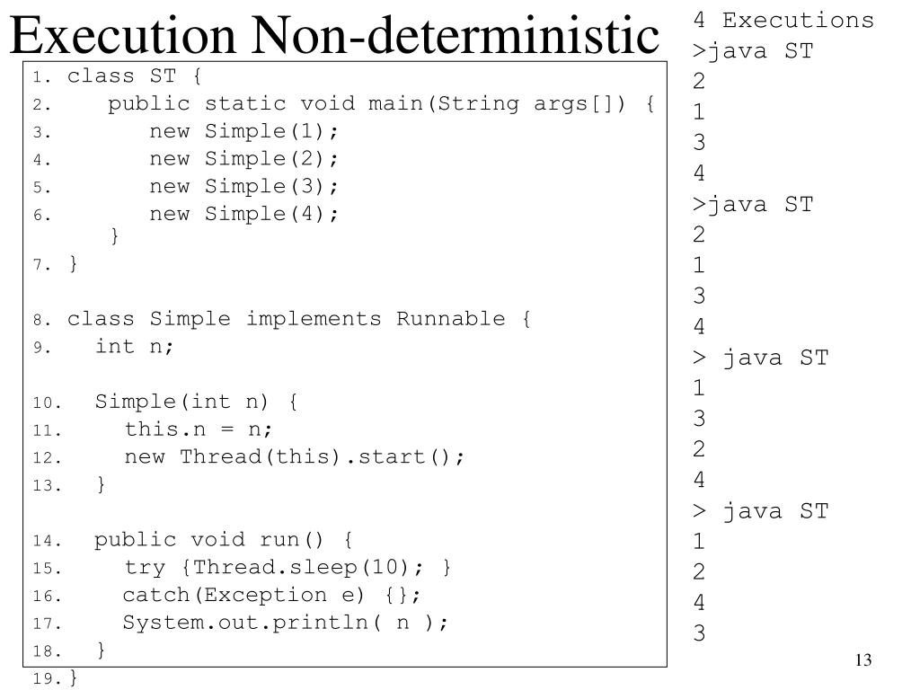 4 Executions >java ST 2 1 3 4 >java ST 2 1 3 4 > java ST 1 3 2 4 > java ST 1 2 4 3 Execution Non-deterministic • class ST { • public static void main(String args[]) { • new Simple(1); • new Simple(2); • new Simple(3); • new Simple(4); } • } • class Simple implements Runnable { • int n; • Simple(int n) { • this.n = n; • new Thread(this).start(); • } • public void run() { • try {Thread.sleep(10); } • catch(Exception e) {}; • System.out.println( n ); • } • }