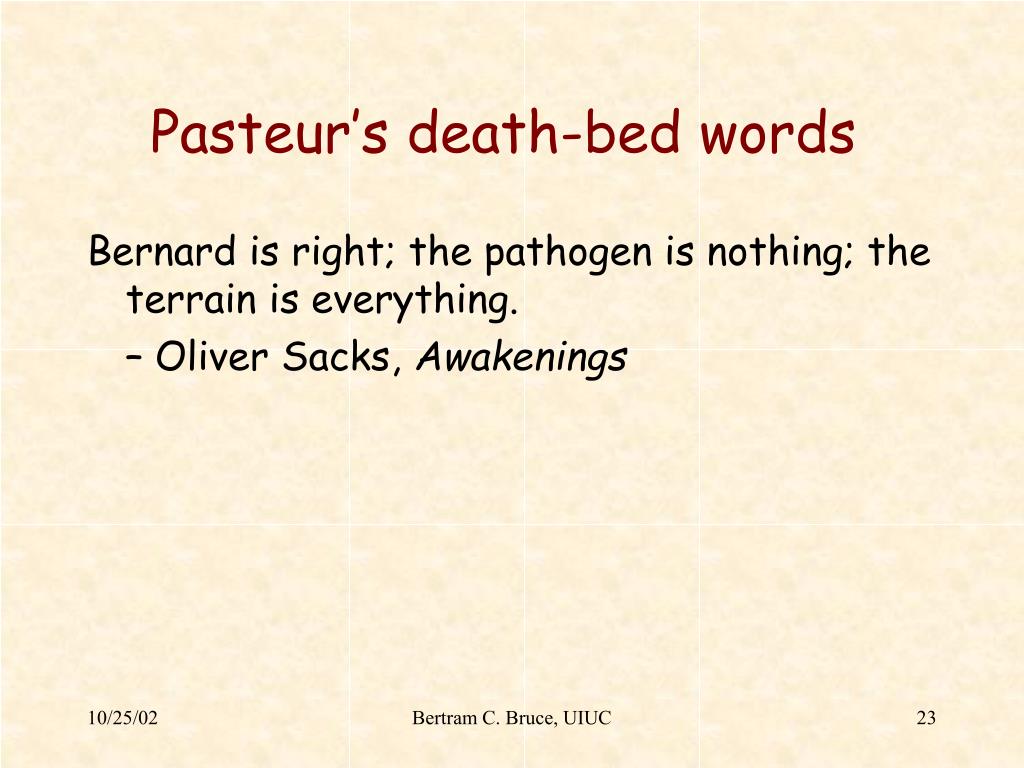 Pasteur’s death-bed words Bernard is right; the pathogen is nothing; the terrain is everything. – Oliver Sacks, Awakenings Bertram C. Bruce, UIUC