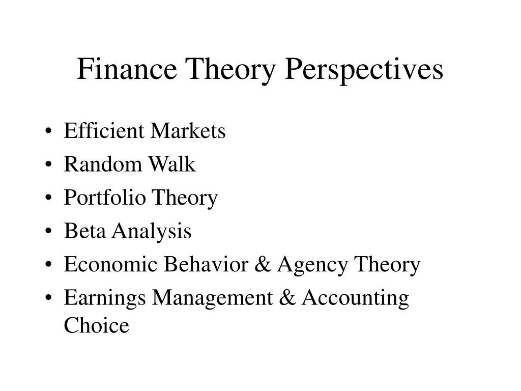 Finance Theory Perspectives • Efficient Markets • Random Walk • Portfolio Theory • Beta Analysis • Economic Behavior & Agency Theory • Earnings Management & Accounting Choice