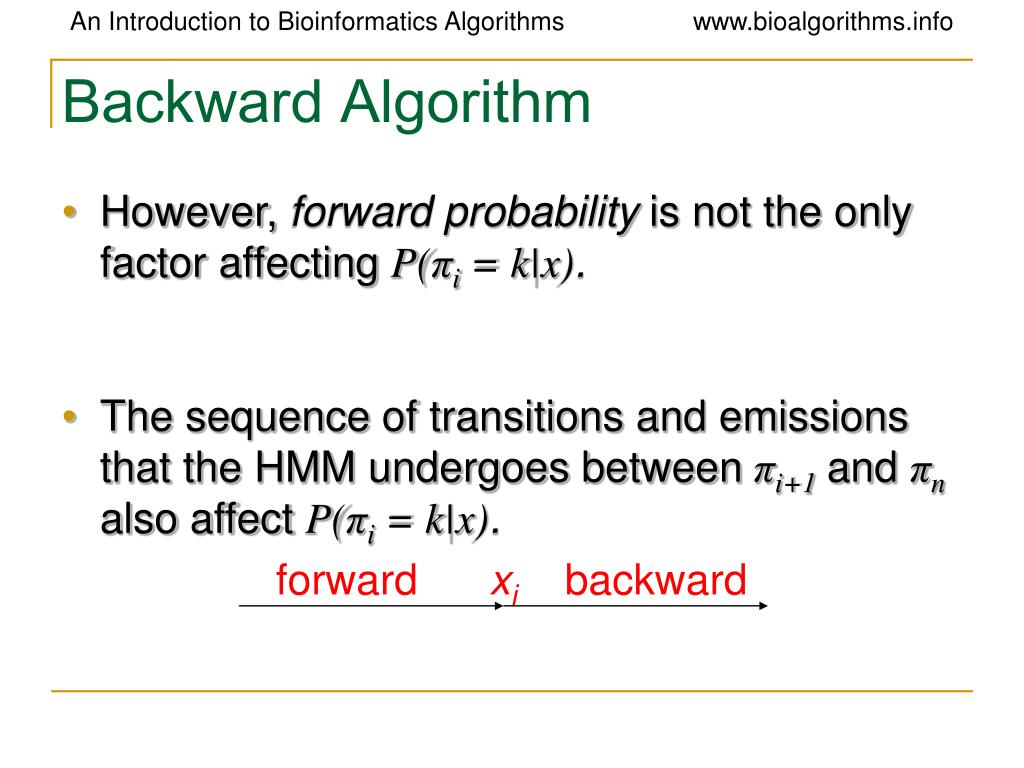 Backward Algorithm • However, forward probability is not the only factor affecting P(πi = k|x). • The sequence of transitions and emissions that the HMM undergoes between πi+1and πnalso affect P(πi = k|x). forward xi backward