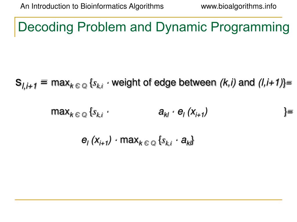 Decoding Problem and Dynamic Programming sl,i+1 = maxkЄ Q {sk,i · weight of edge between (k,i) and (l,i+1)}= maxkЄ Q {sk,i · akl · el (xi+1) }= el (xi+1) · maxkЄ Q {sk,i · akl}