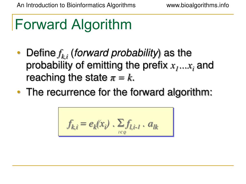 Forward Algorithm • Define fk,i(forward probability) as the probability of emitting the prefix x1…xiand reaching the state π = k. • The recurrence for the forward algorithm: fk,i = ek(xi) . Σfl,i-1 . alk l Є Q