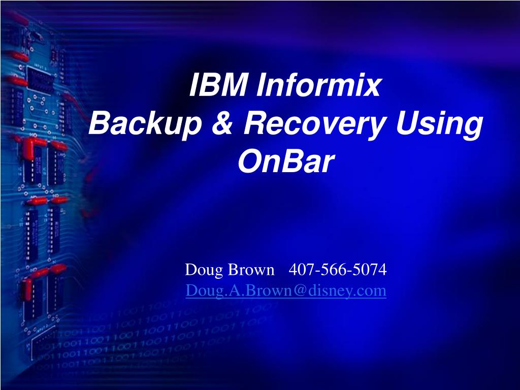 IBM InformixBackup & Recovery Using OnBar Doug Brown 407-566-5074 Doug.A.Brown@disney.com