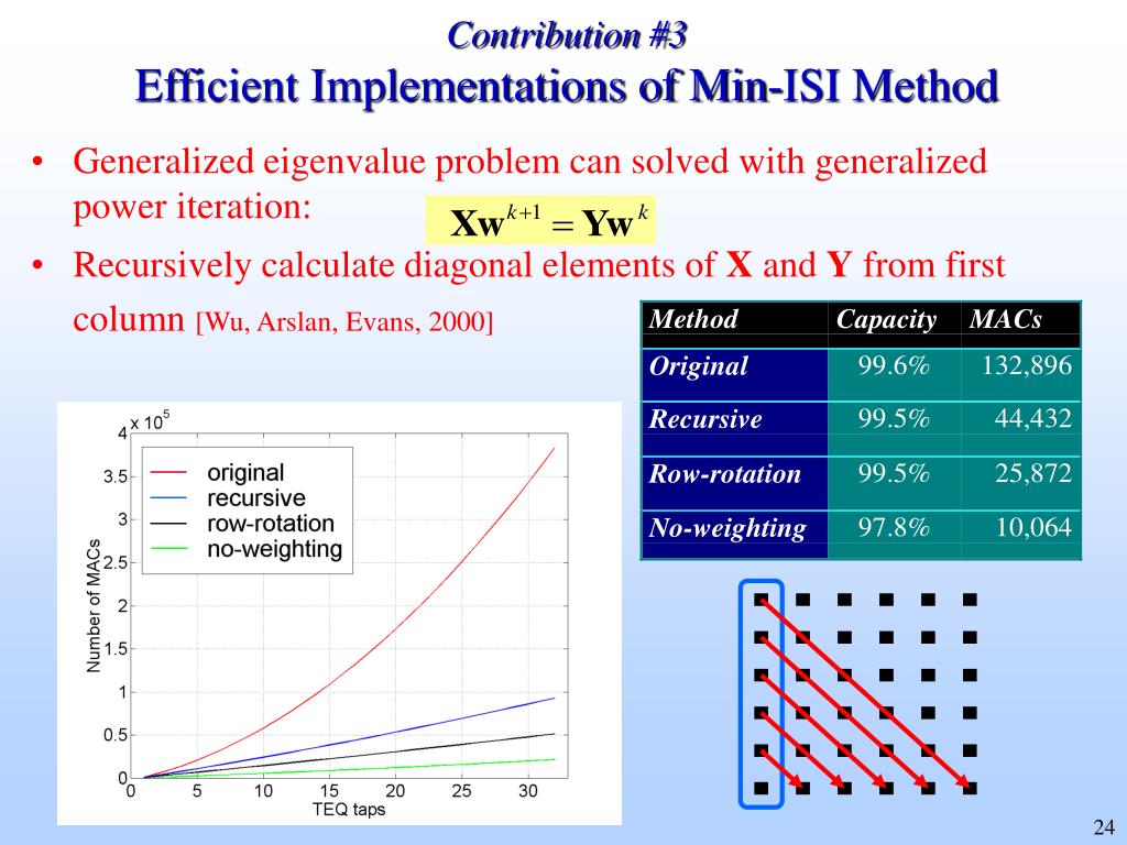 Contribution #3Efficient Implementations of Min-ISI Method • Generalized eigenvalue problem can solved with generalized power iteration: • Recursively calculate diagonal elements of X and Y from first column [Wu, Arslan, Evans, 2000]