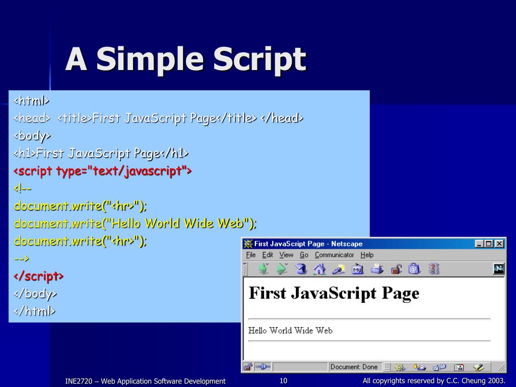 A Simple Script <html> <head> <title>First JavaScript Page</title> </head> <body> <h1>First JavaScript Page</h1> <script type="text/javascript"> <!-- document.write("<hr>"); document.write("Hello World Wide Web"); document.write("<hr>"); --> </script> </body> </html> All copyrights reserved by C.C. Cheung 2003.
