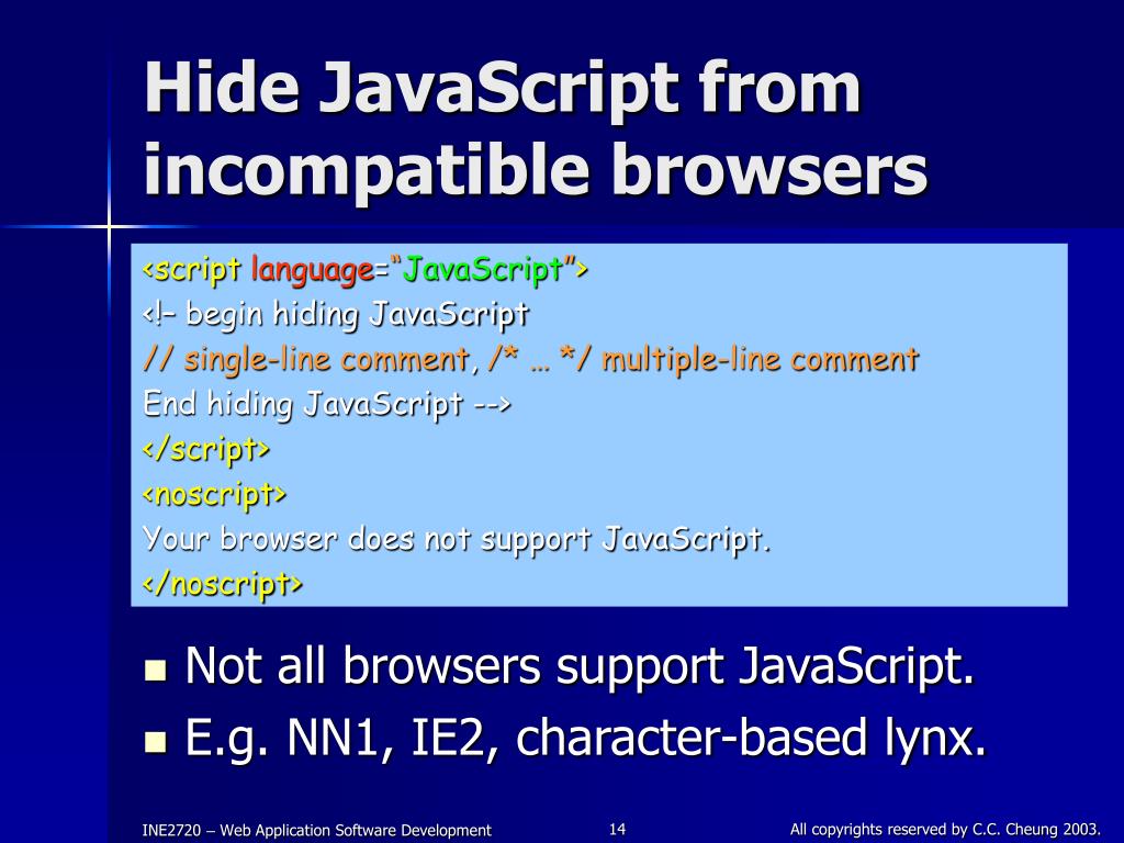Hide JavaScript from incompatible browsers • Not all browsers support JavaScript. • E.g. NN1, IE2, character-based lynx. <script language=“JavaScript”> <!– begin hiding JavaScript // single-line comment, /* … */ multiple-line comment End hiding JavaScript --> </script> <noscript> Your browser does not support JavaScript. </noscript> All copyrights reserved by C.C. Cheung 2003.