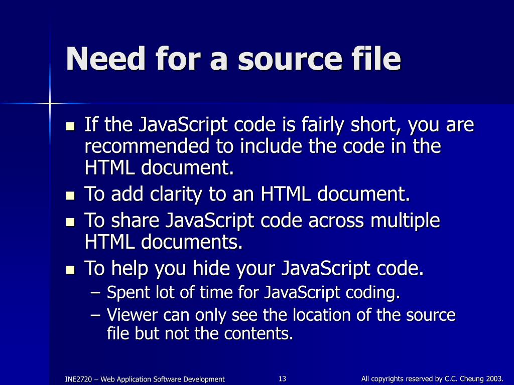 Need for a source file • If the JavaScript code is fairly short, you are recommended to include the code in the HTML document. • To add clarity to an HTML document. • To share JavaScript code across multiple HTML documents. • To help you hide your JavaScript code. • Spent lot of time for JavaScript coding. • Viewer can only see the location of the source file but not the contents. All copyrights reserved by C.C. Cheung 2003.
