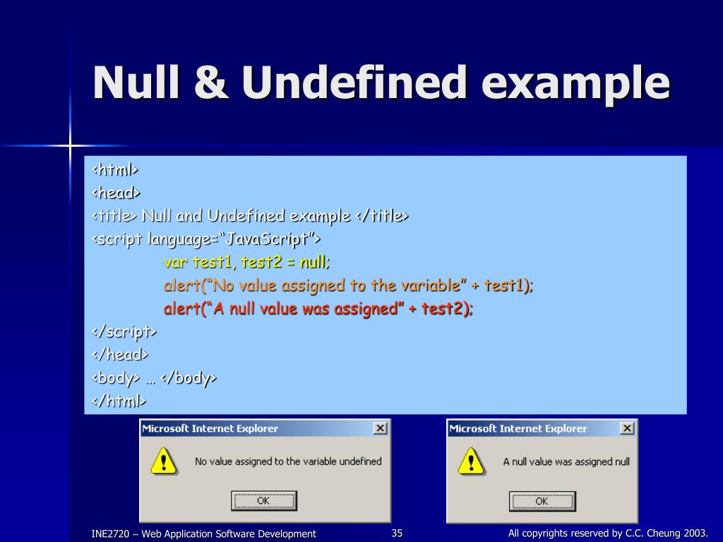 Null & Undefined example <html> <head> <title> Null and Undefined example </title> <script language=“JavaScript”> var test1, test2 = null; alert(“No value assigned to the variable” + test1); alert(“A null value was assigned” + test2); </script> </head> <body> … </body> </html> All copyrights reserved by C.C. Cheung 2003.