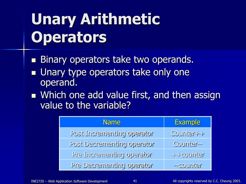 Unary Arithmetic Operators • Binary operators take two operands. • Unary type operators take only one operand. • Which one add value first, and then assign value to the variable? All copyrights reserved by C.C. Cheung 2003.