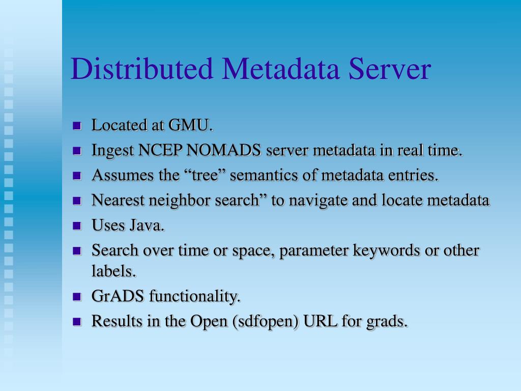 Distributed Metadata Server • Located at GMU. • Ingest NCEP NOMADS server metadata in real time. • Assumes the “tree” semantics of metadata entries. • Nearest neighbor search” to navigate and locate metadata • Uses Java. • Search over time or space, parameter keywords or other labels. • GrADS functionality. • Results in the Open (sdfopen) URL for grads.