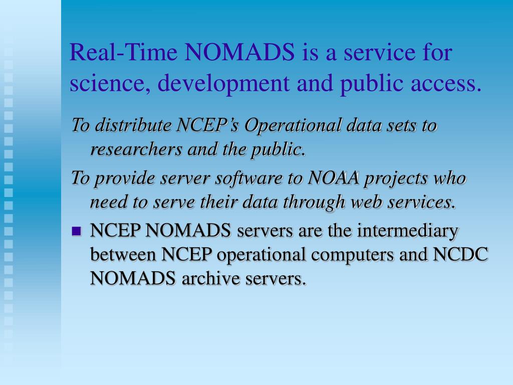 Real-Time NOMADS is a service for science, development and public access. To distribute NCEP’s Operational data sets to researchers and the public. To provide server software to NOAA projects who need to serve their data through web services. • NCEP NOMADS servers are the intermediary between NCEP operational computers and NCDC NOMADS archive servers.