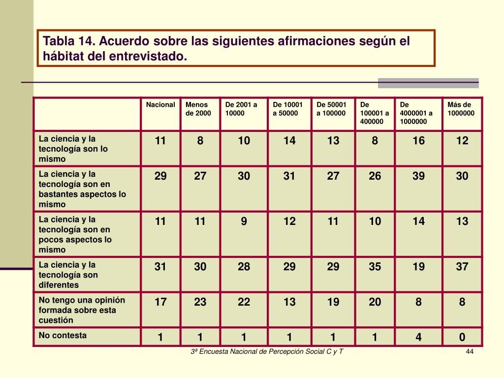 Tabla 14. Acuerdo sobre las siguientes afirmaciones según el hábitat del entrevistado. 3ª Encuesta Nacional de Percepción Social C y T