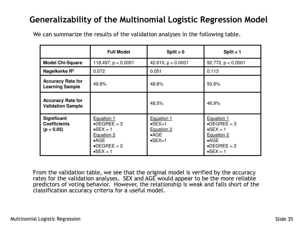 Generalizability of the Multinomial Logistic Regression Model We can summarize the results of the validation analyses in the following table. From the validation table, we see that the original model is verified by the accuracy rates for the validation analyses. SEX and AGE would appear to be the more reliable predictors of voting behavior. However, the relationship is weak and falls short of the classification accuracy criteria for a useful model. Multinomial Logistic Regression