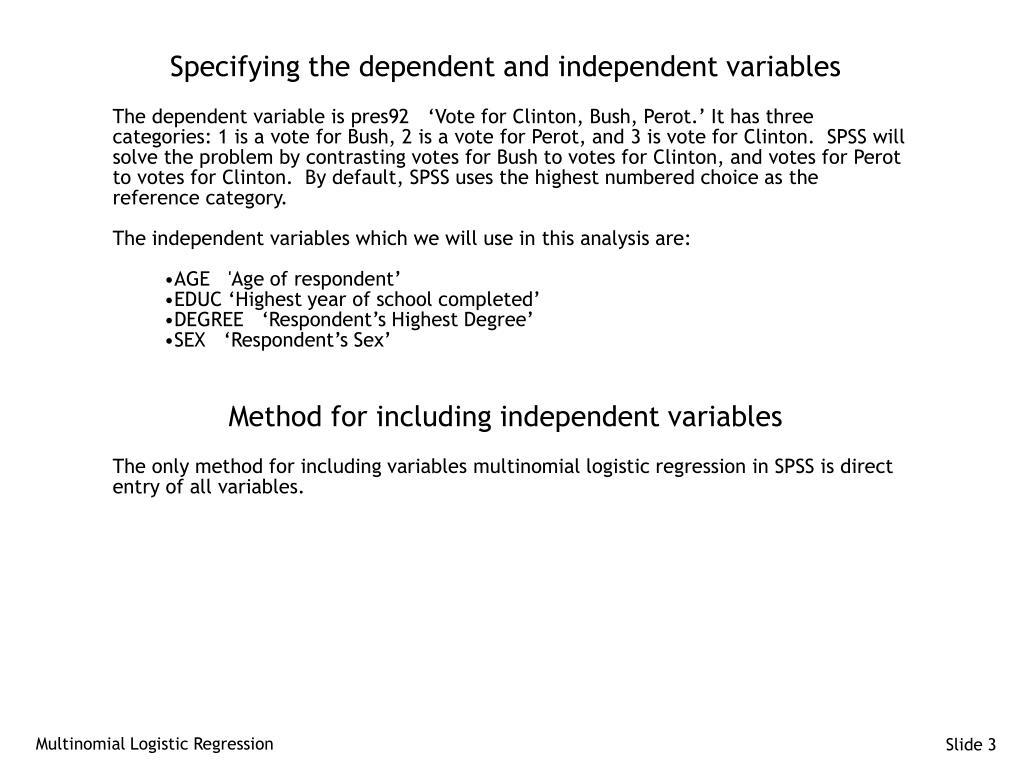 The SPSS Sample Problem To demonstrate multinomial logistic regression, we will work the sample problem for multinomial logistic regression in SPSS Regression Models 10.0, pages 65 - 82. The description of the problem found on page 66 states that the 1996 General Social Survey asked people who they voted for in 1992. Demographic variables from the GSS, such as sex, age, and education, can be used to identify the relationships between voter demographics and voter preference. The data for this problem is: voter.sav. Multinomial Logistic Regression