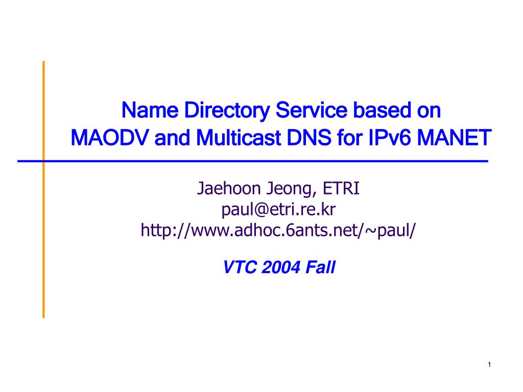 Name Directory Service based onMAODV and Multicast DNS for IPv6 MANET Jaehoon Jeong, ETRIpaul@etri.re.krhttp://www.adhoc.6ants.net/~paul/ VTC 2004 Fall