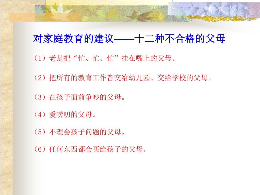 对家庭教育的建议——十二种不合格的父母 (1)老是把“忙、忙、忙”挂在嘴上的父母。 (2)把所有的教育工作皆交给幼儿园、交给学校的父母。 (3)在孩子面前争吵的父母。 (4)爱唠叨的父母。 (5)不理会孩子问题的父母。 (6)任何东西都会买给孩子的父母。